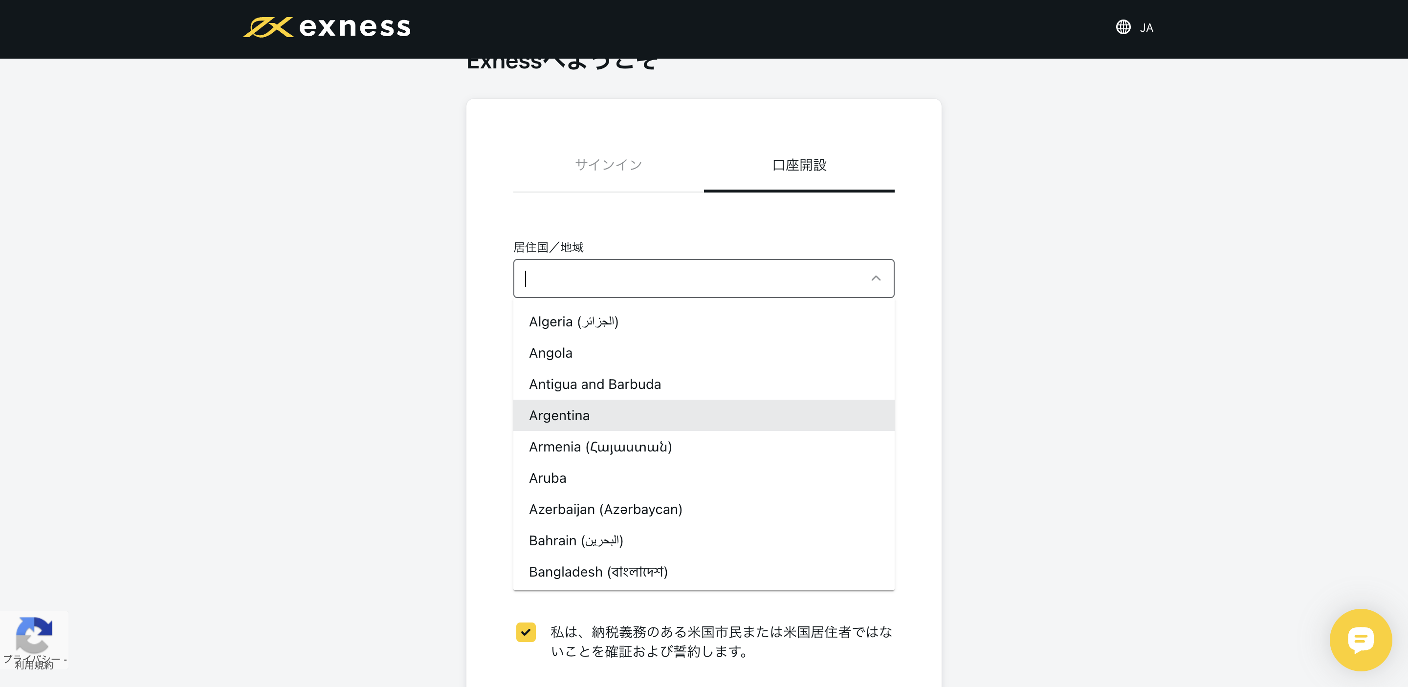 口座登録フォームで「口座開設」が選択されていることを確認し、居住国を選びます。